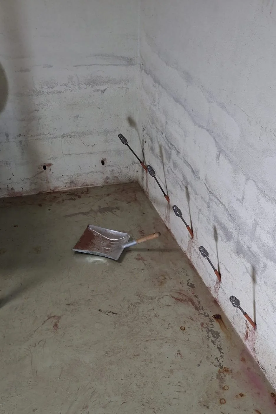 Watervoerende gemetselde vloer/wand aansluiting (Links) en gemetselde wand op een betonvloer (Rechts) met optrekkend vocht beide geïnjecteerd met Liquidseal ontwikkeld door Gel injectie Nederland met een droog eind resultaat.
